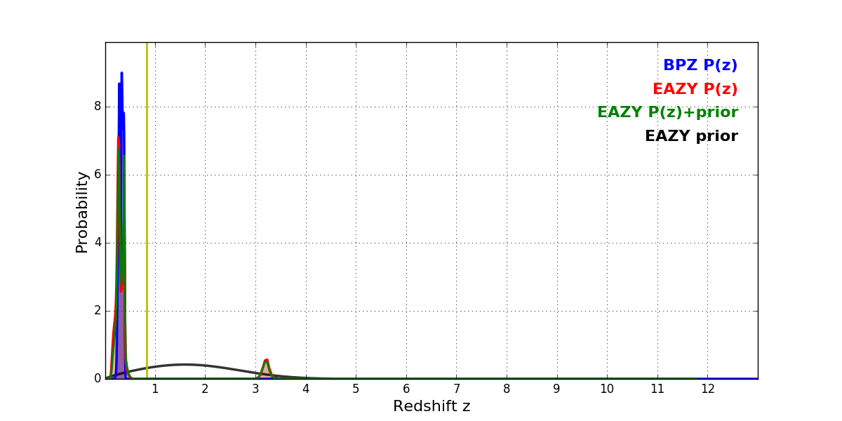 In P(z) plots: Yellow lines mark the cluster redshift z = 0.833,
