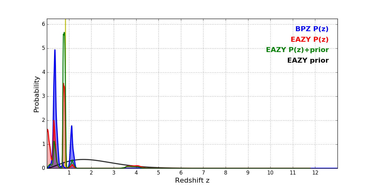 In P(z) plots: Yellow lines mark the cluster redshift z = 0.833,