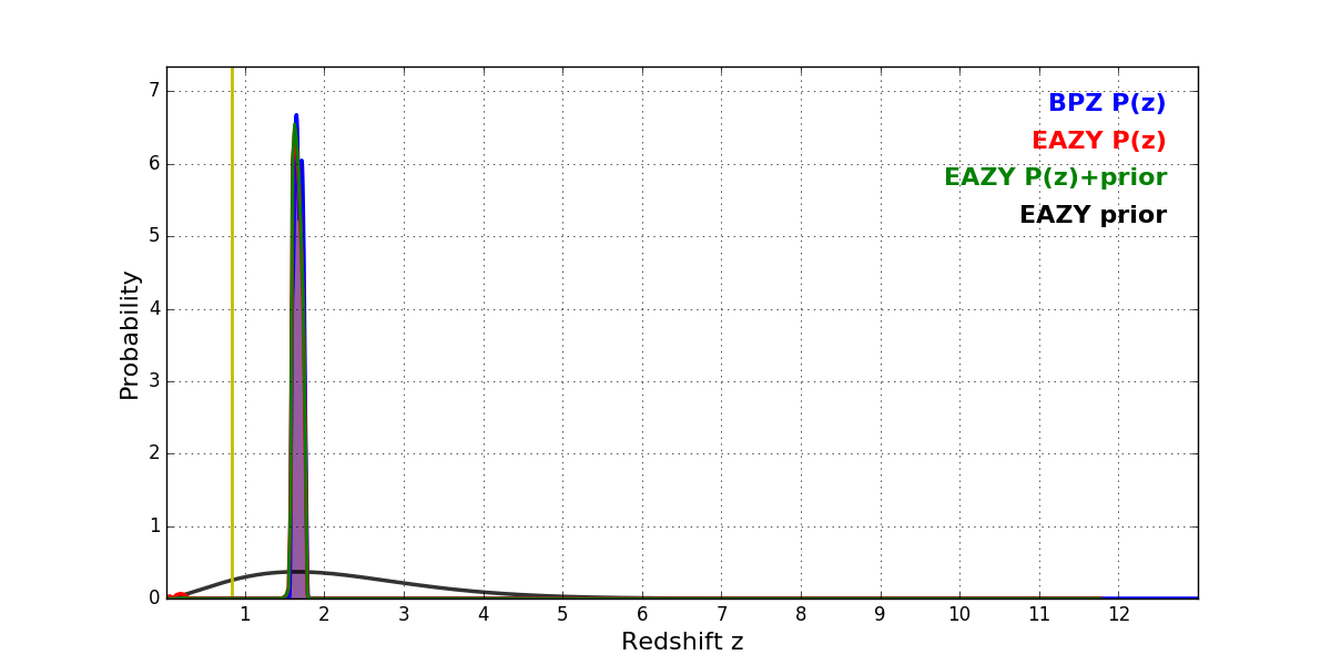 In P(z) plots: Yellow lines mark the cluster redshift z = 0.833,