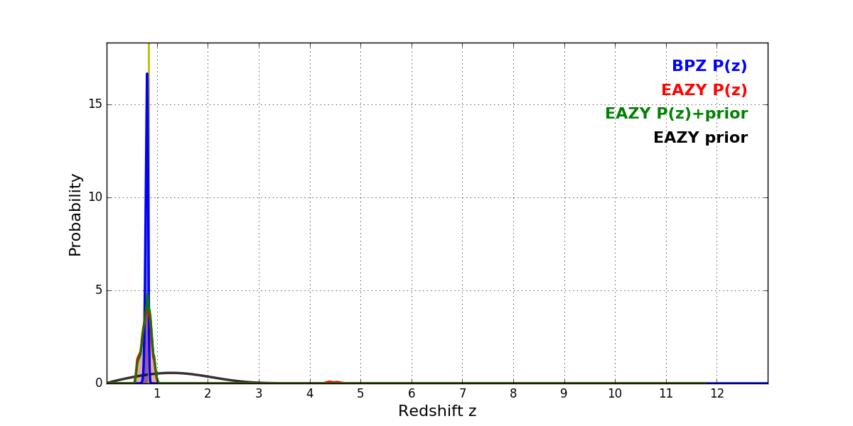 In P(z) plots: Yellow lines mark the cluster redshift z = 0.833,