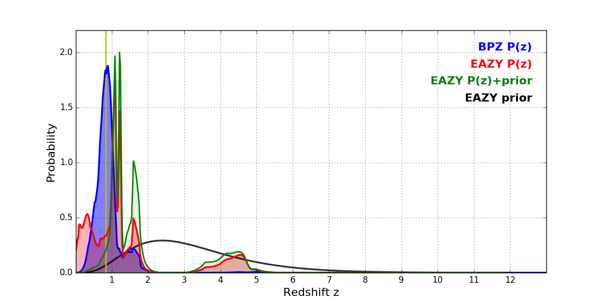 In P(z) plots: Yellow lines mark the cluster redshift z = 0.833,