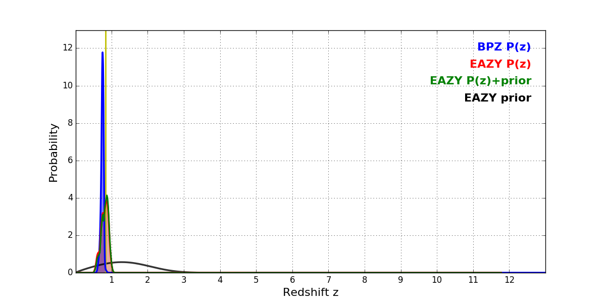 In P(z) plots: Yellow lines mark the cluster redshift z = 0.833,