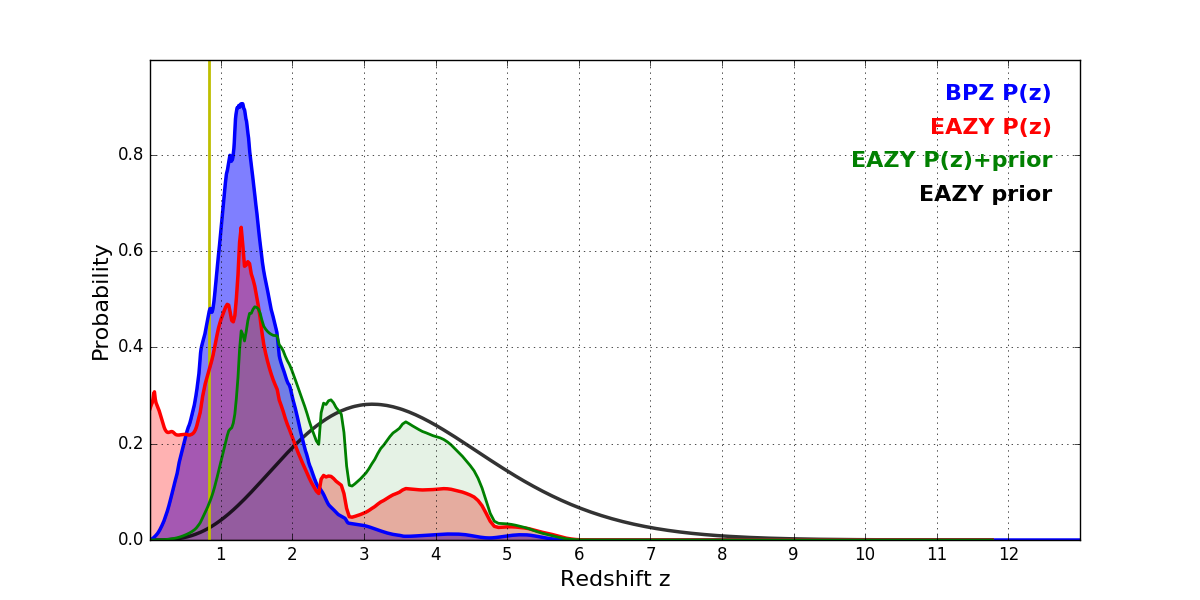 In P(z) plots: Yellow lines mark the cluster redshift z = 0.833,