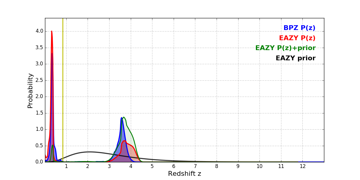 In P(z) plots: Yellow lines mark the cluster redshift z = 0.833,