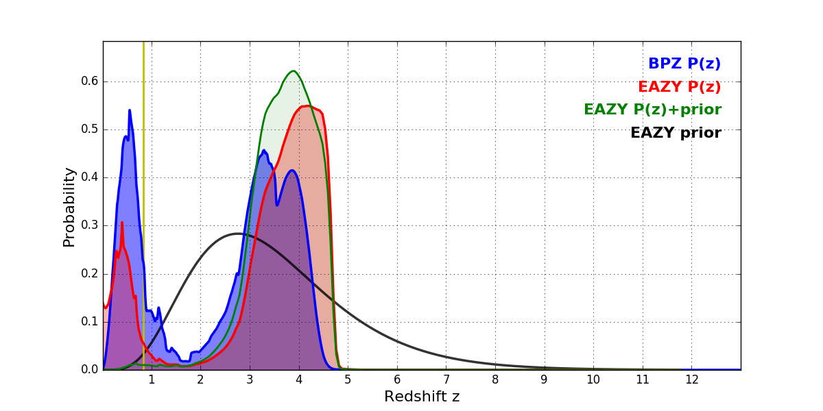 In P(z) plots: Yellow lines mark the cluster redshift z = 0.833,