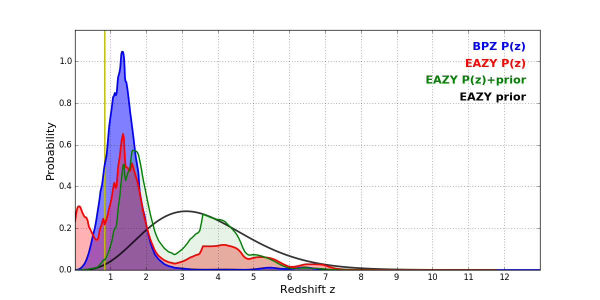 In P(z) plots: Yellow lines mark the cluster redshift z = 0.833,