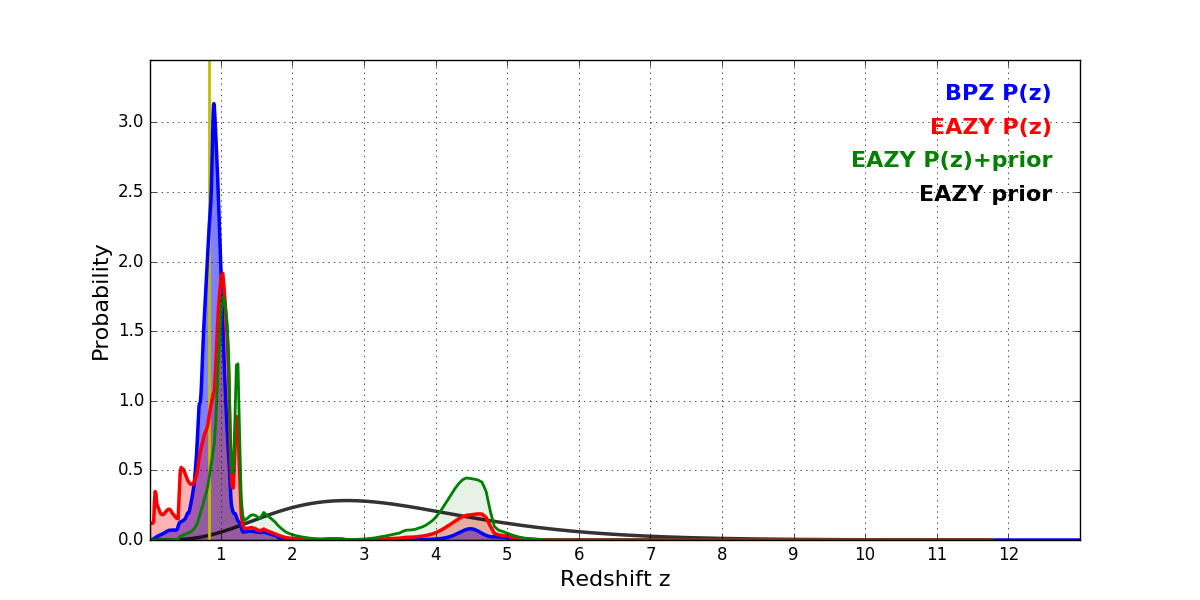 In P(z) plots: Yellow lines mark the cluster redshift z = 0.833,