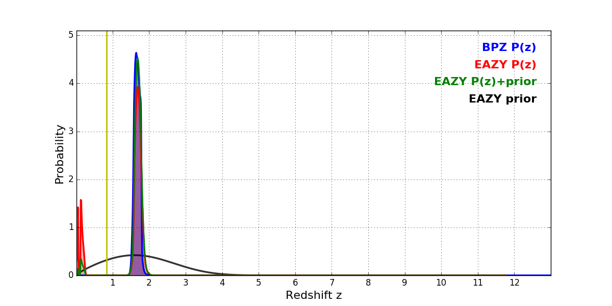 In P(z) plots: Yellow lines mark the cluster redshift z = 0.833,