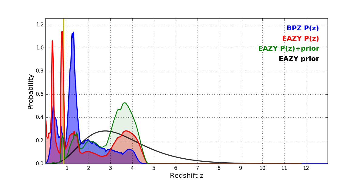 In P(z) plots: Yellow lines mark the cluster redshift z = 0.833,