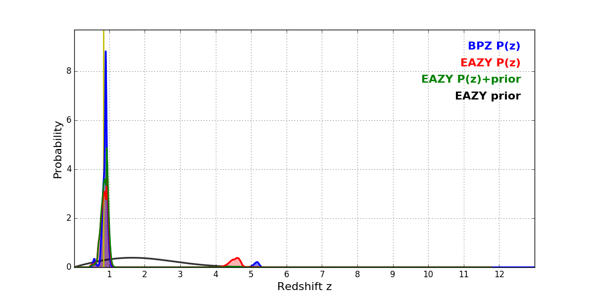 In P(z) plots: Yellow lines mark the cluster redshift z = 0.833,