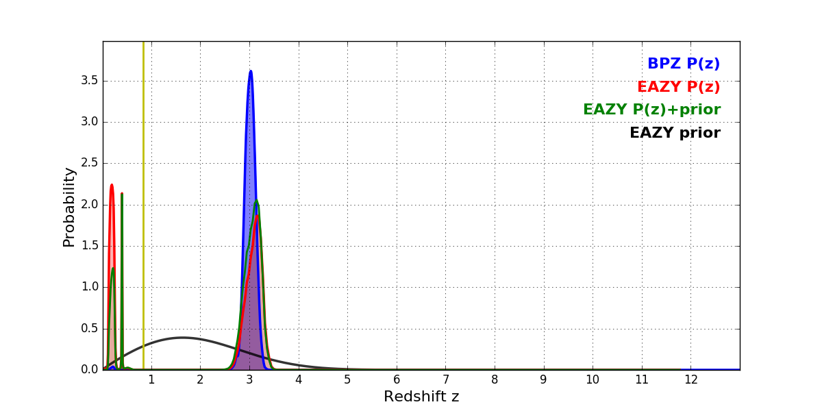 In P(z) plots: Yellow lines mark the cluster redshift z = 0.833,