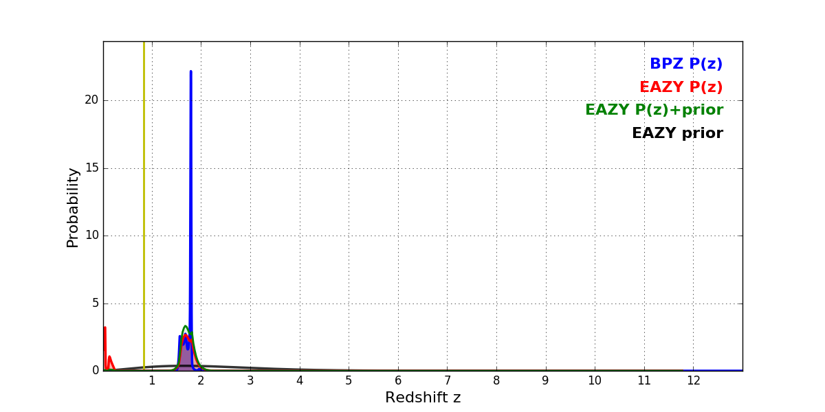 In P(z) plots: Yellow lines mark the cluster redshift z = 0.833,