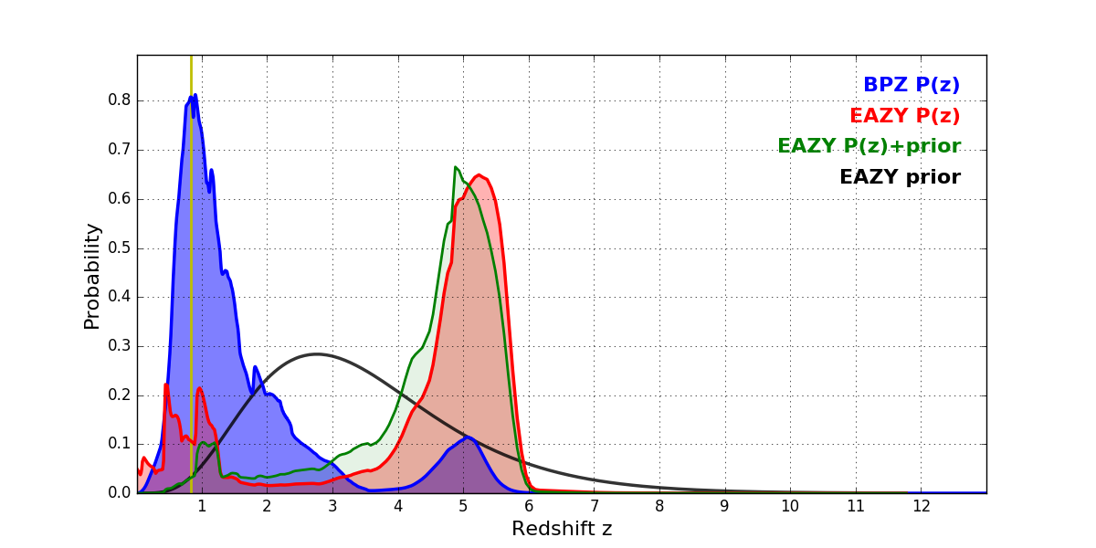 In P(z) plots: Yellow lines mark the cluster redshift z = 0.833,
