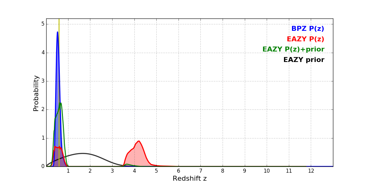 In P(z) plots: Yellow lines mark the cluster redshift z = 0.586,