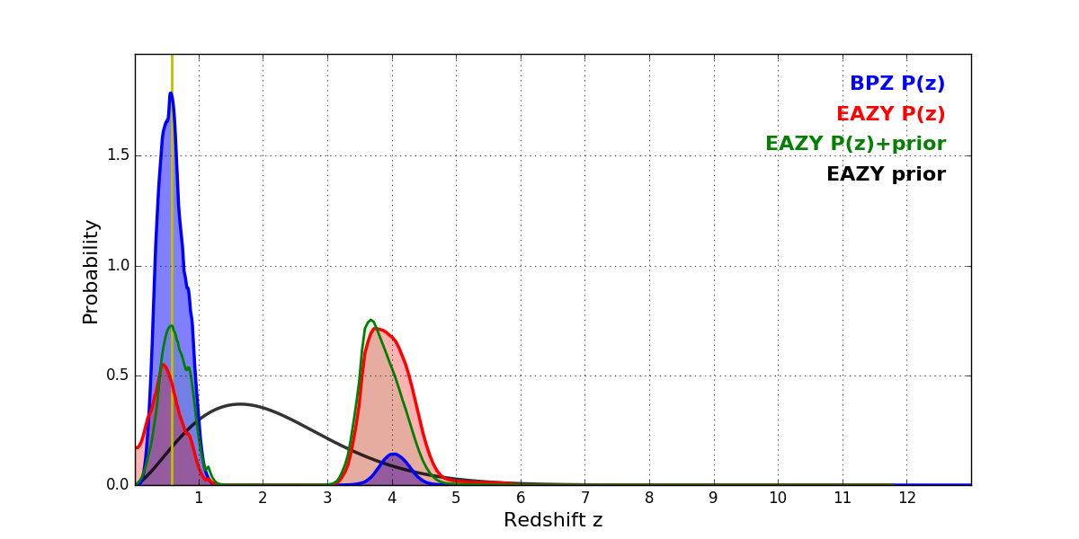 In P(z) plots: Yellow lines mark the cluster redshift z = 0.586,