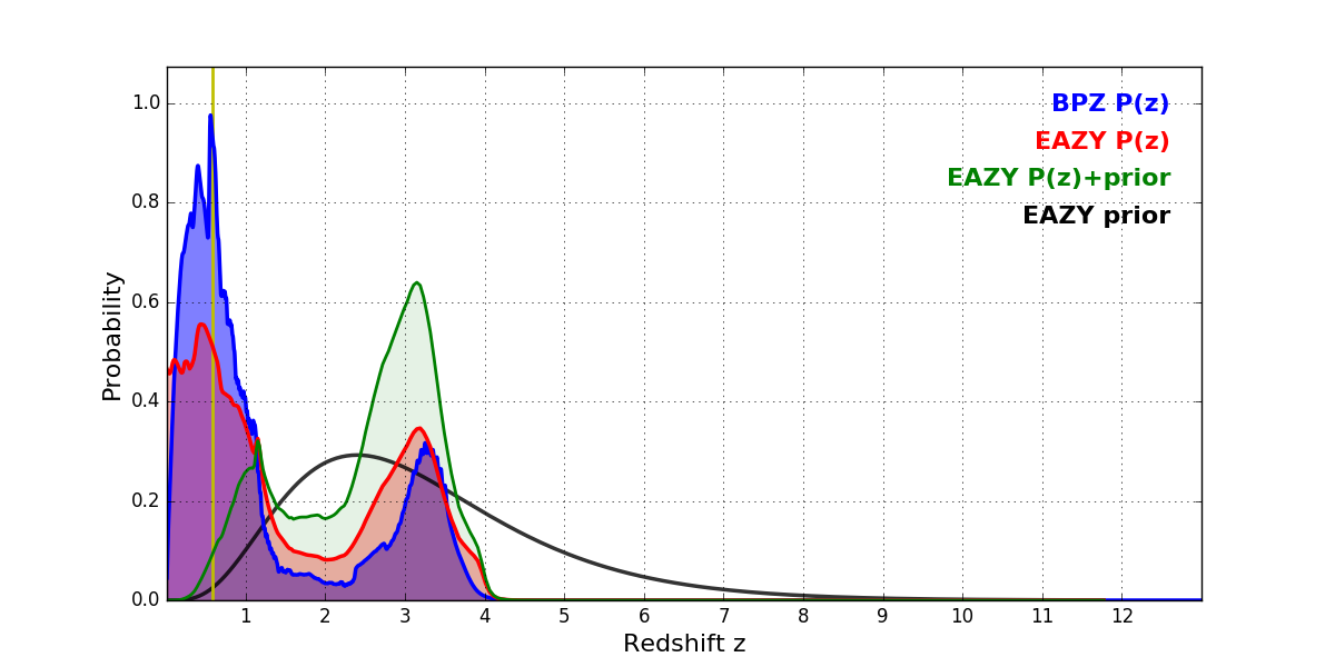 In P(z) plots: Yellow lines mark the cluster redshift z = 0.586,