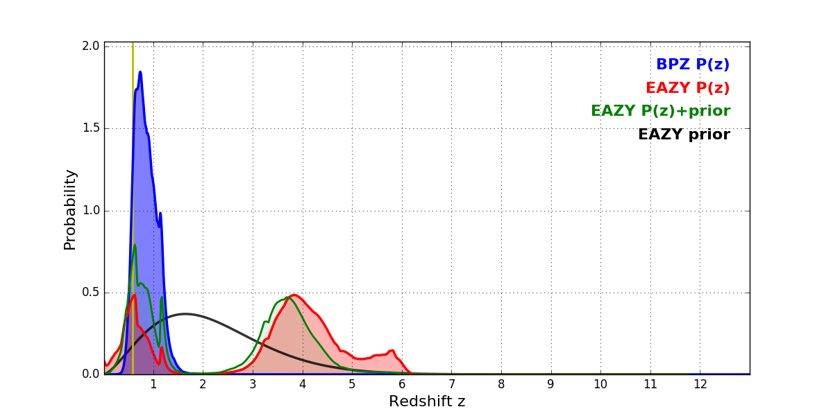 In P(z) plots: Yellow lines mark the cluster redshift z = 0.586,