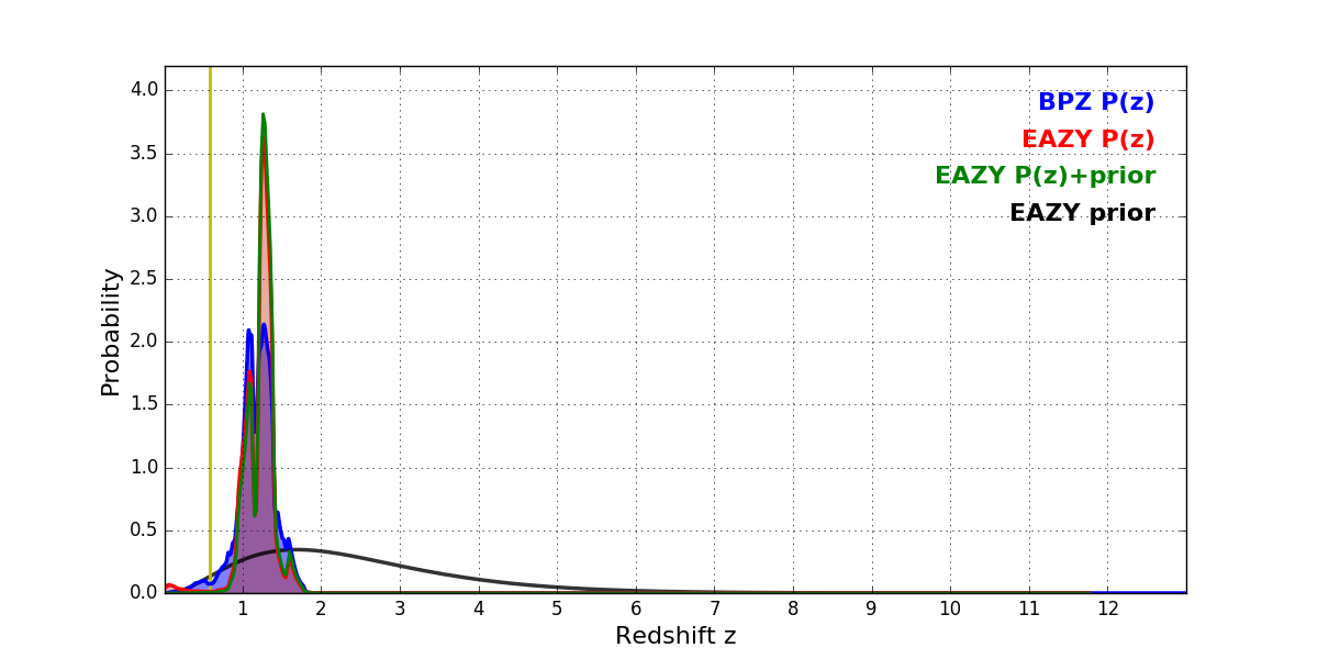 In P(z) plots: Yellow lines mark the cluster redshift z = 0.586,
