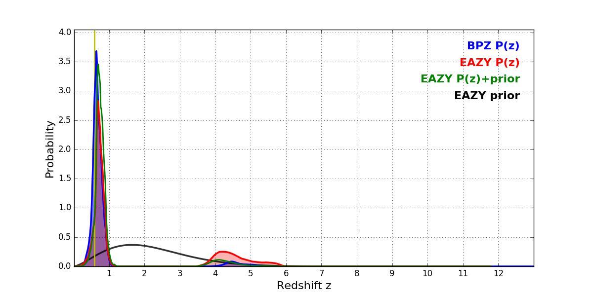 In P(z) plots: Yellow lines mark the cluster redshift z = 0.586,