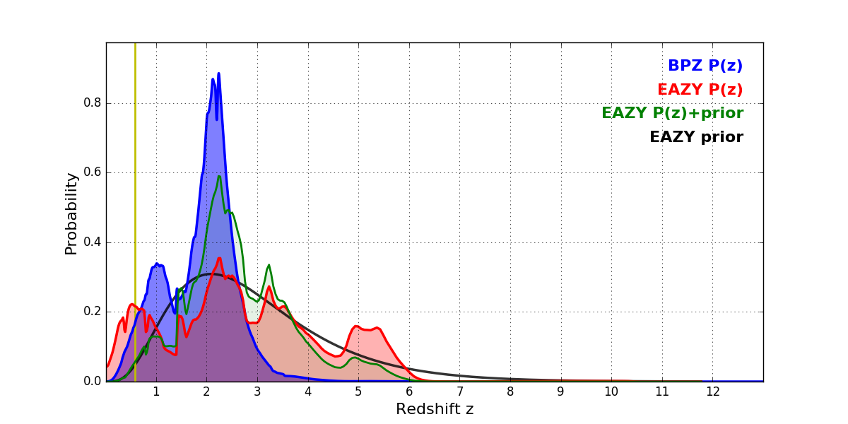 In P(z) plots: Yellow lines mark the cluster redshift z = 0.586,
