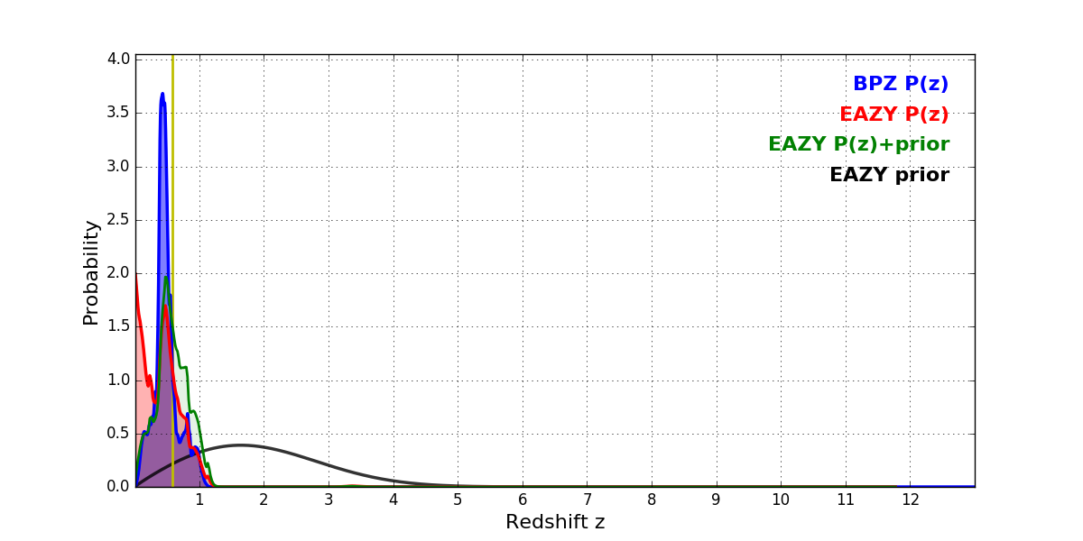In P(z) plots: Yellow lines mark the cluster redshift z = 0.586,