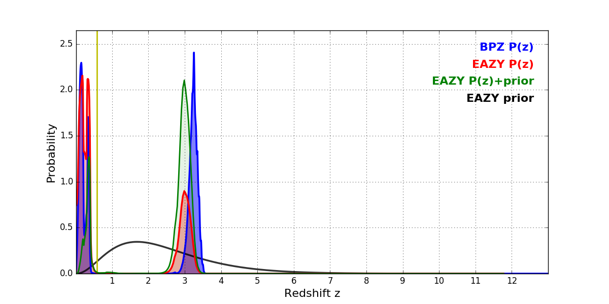 In P(z) plots: Yellow lines mark the cluster redshift z = 0.586,