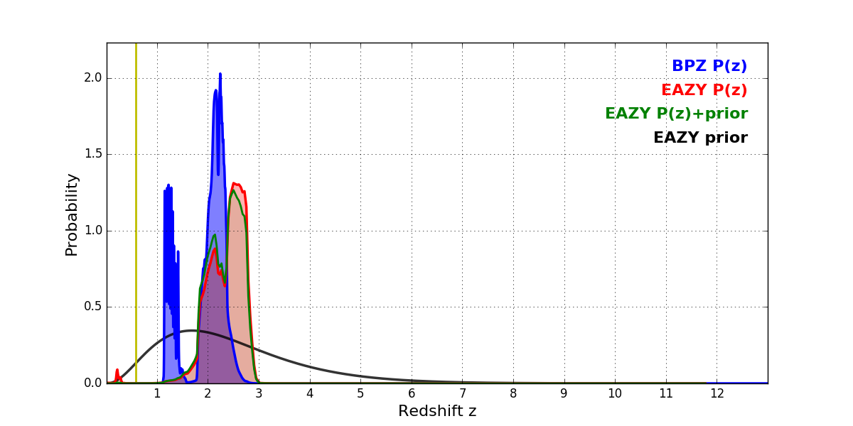 In P(z) plots: Yellow lines mark the cluster redshift z = 0.586,