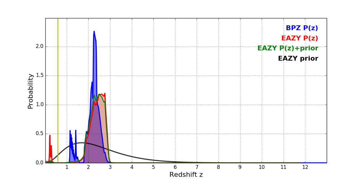 In P(z) plots: Yellow lines mark the cluster redshift z = 0.586,