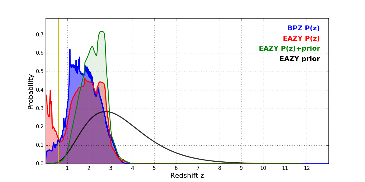 In P(z) plots: Yellow lines mark the cluster redshift z = 0.586,