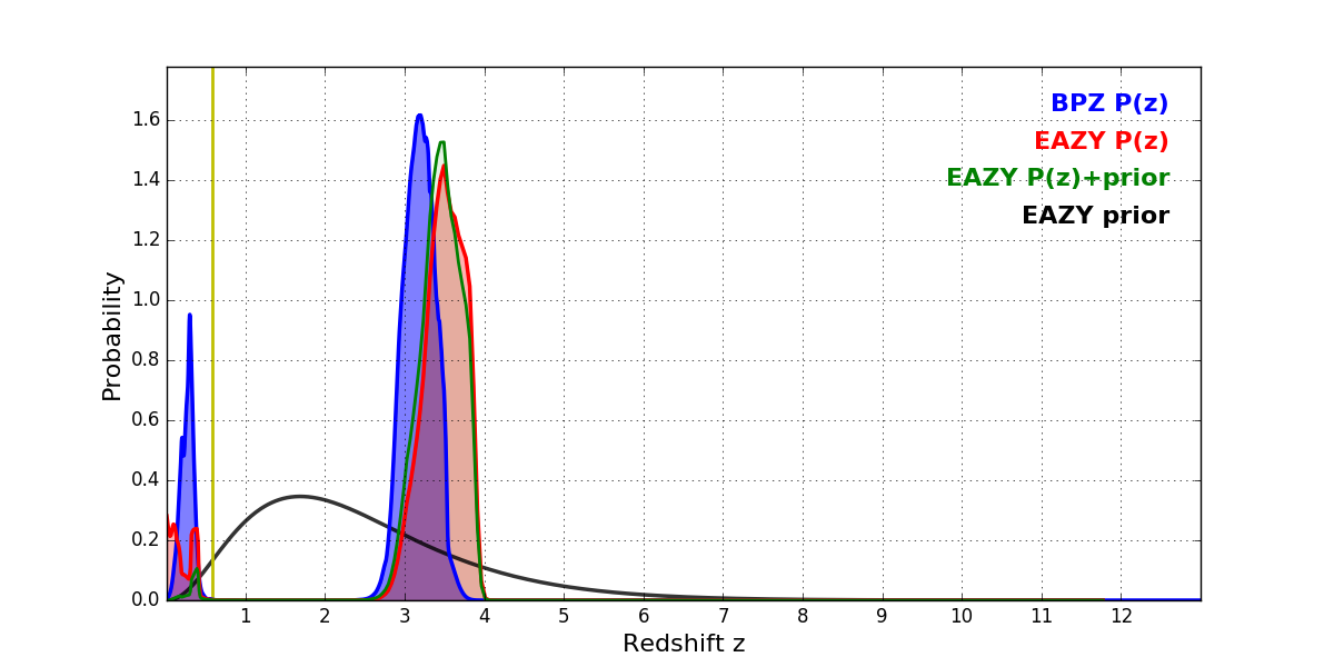 In P(z) plots: Yellow lines mark the cluster redshift z = 0.586,