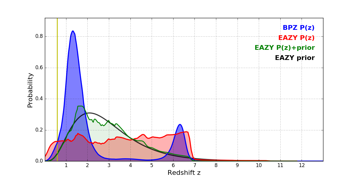 In P(z) plots: Yellow lines mark the cluster redshift z = 0.586,