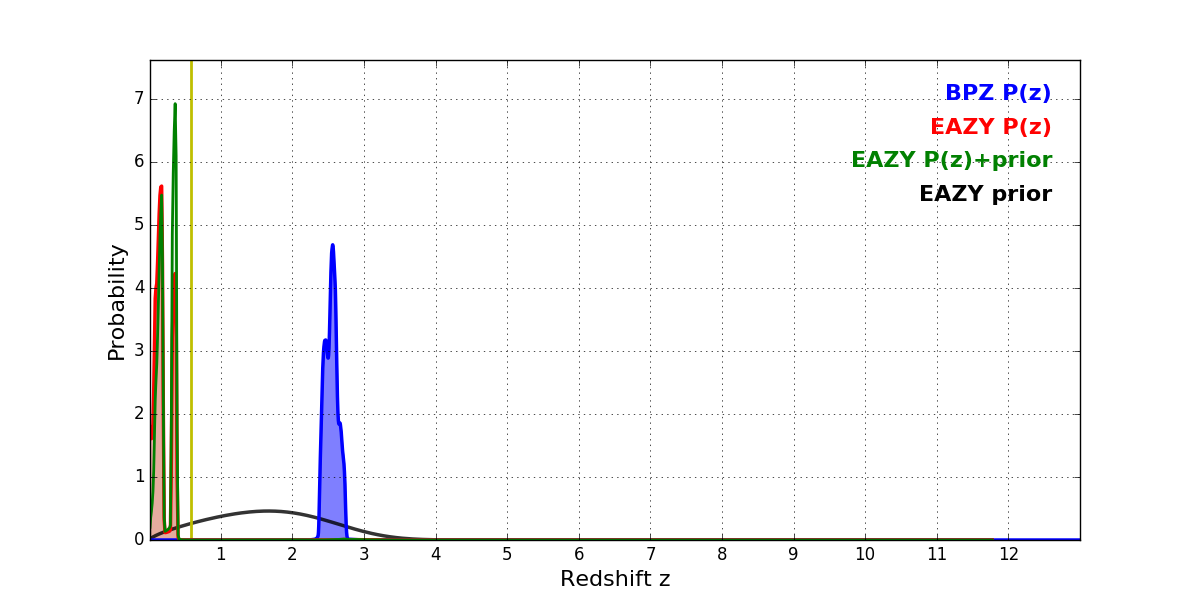 In P(z) plots: Yellow lines mark the cluster redshift z = 0.586,