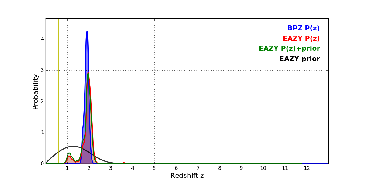 In P(z) plots: Yellow lines mark the cluster redshift z = 0.586,