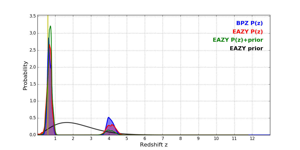 In P(z) plots: Yellow lines mark the cluster redshift z = 0.586,