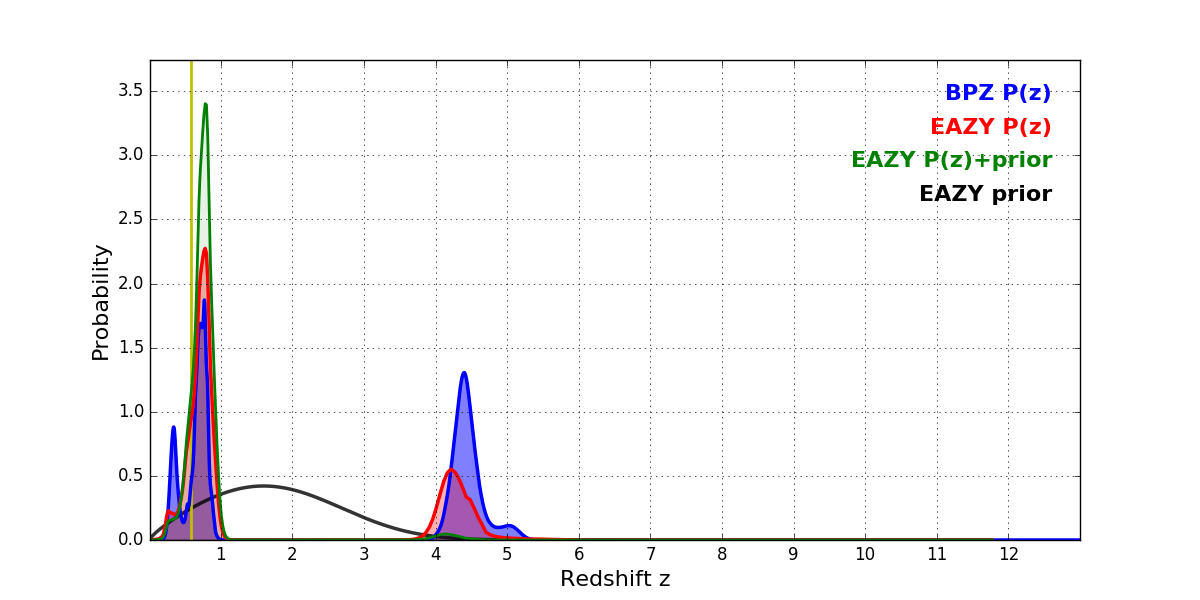 In P(z) plots: Yellow lines mark the cluster redshift z = 0.586,