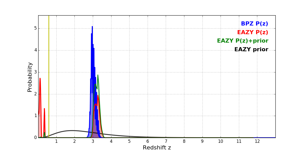 In P(z) plots: Yellow lines mark the cluster redshift z = 0.586,