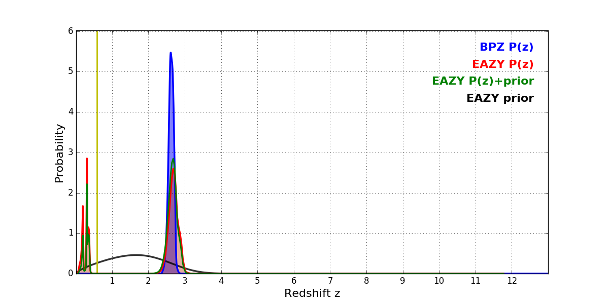 In P(z) plots: Yellow lines mark the cluster redshift z = 0.586,