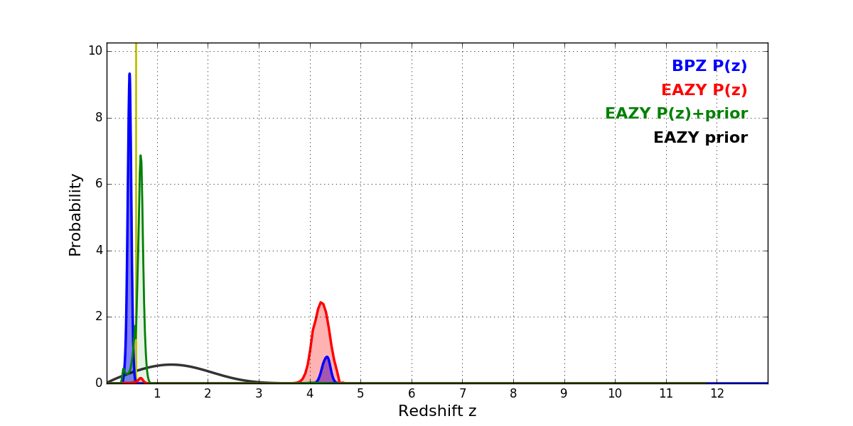 In P(z) plots: Yellow lines mark the cluster redshift z = 0.586,