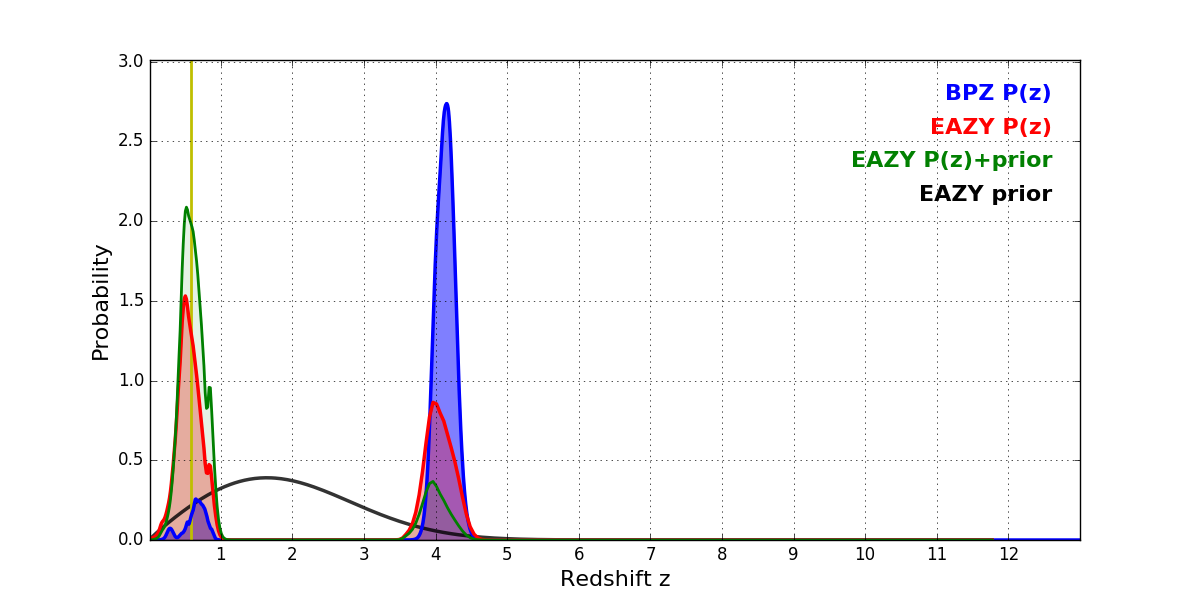In P(z) plots: Yellow lines mark the cluster redshift z = 0.586,