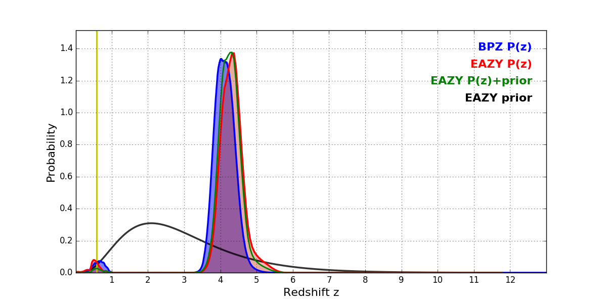 In P(z) plots: Yellow lines mark the cluster redshift z = 0.586,