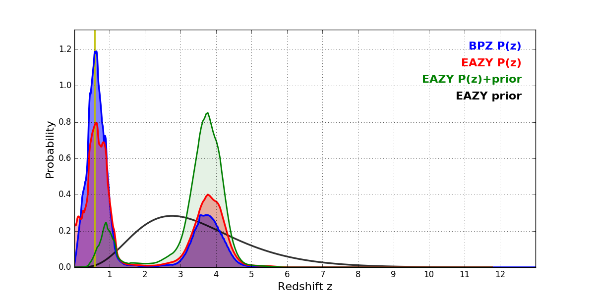 In P(z) plots: Yellow lines mark the cluster redshift z = 0.586,