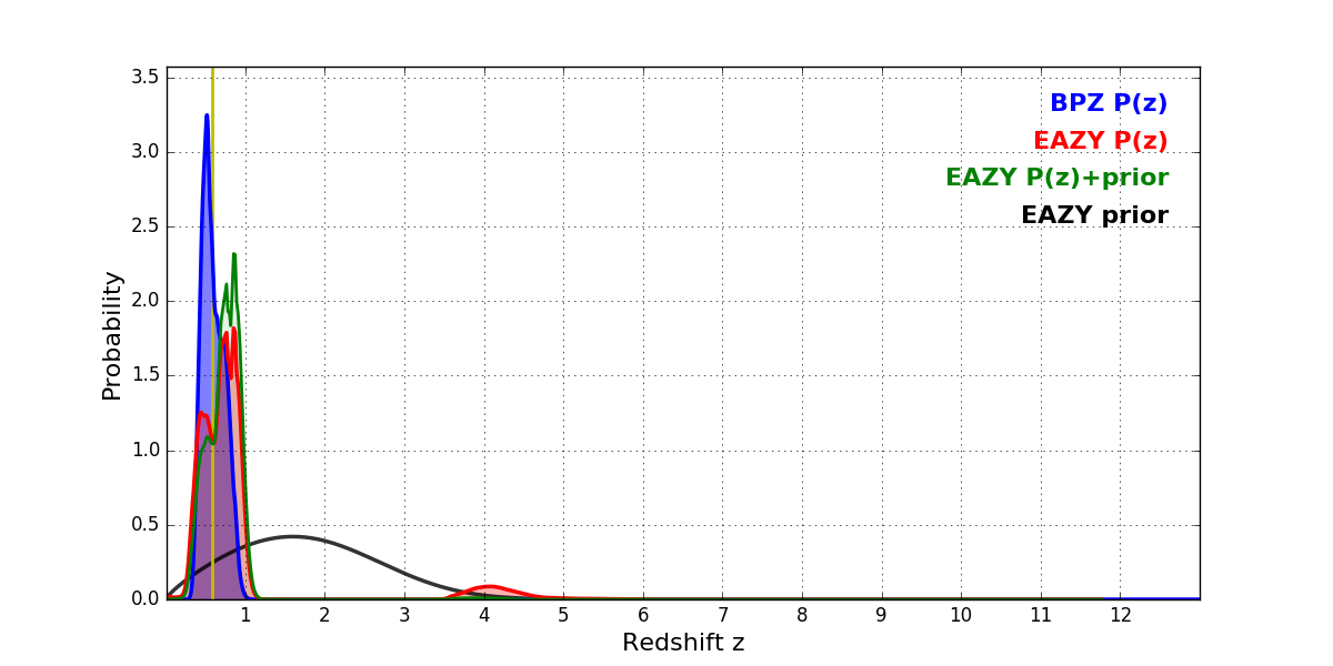 In P(z) plots: Yellow lines mark the cluster redshift z = 0.586,