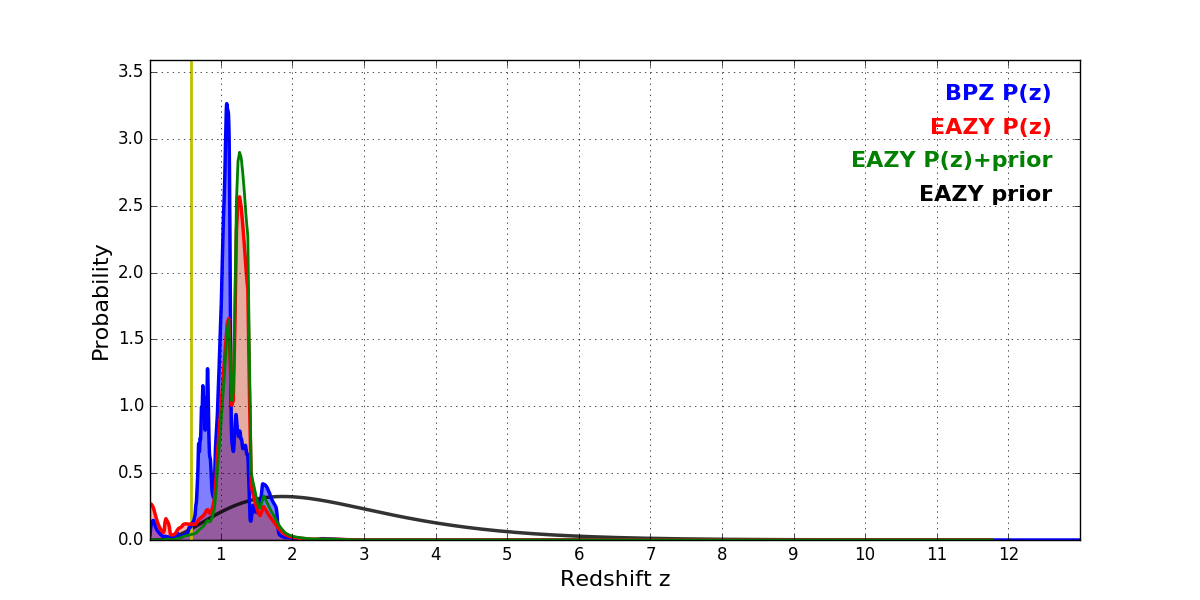 In P(z) plots: Yellow lines mark the cluster redshift z = 0.586,