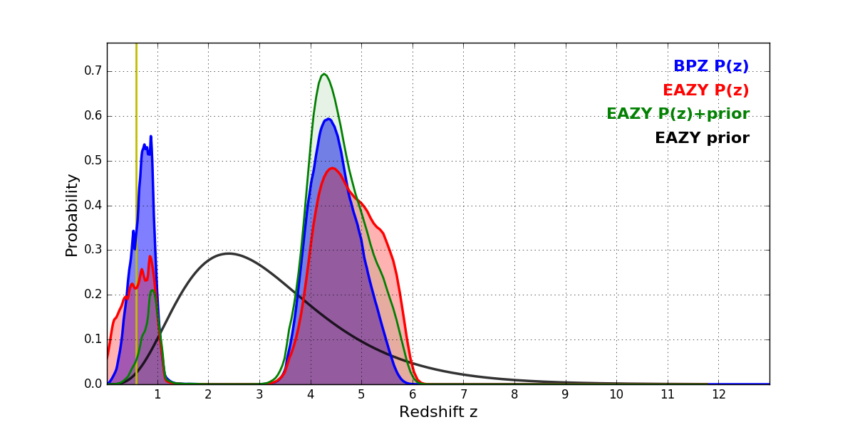 In P(z) plots: Yellow lines mark the cluster redshift z = 0.586,