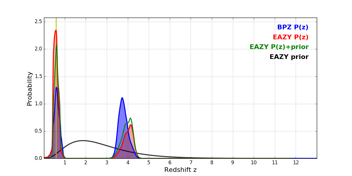 In P(z) plots: Yellow lines mark the cluster redshift z = 0.586,