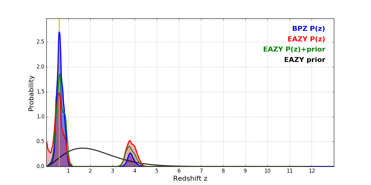 In P(z) plots: Yellow lines mark the cluster redshift z = 0.586,
