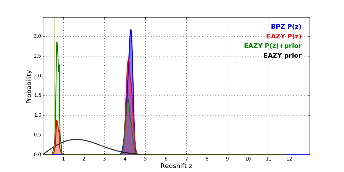 In P(z) plots: Yellow lines mark the cluster redshift z = 0.586,