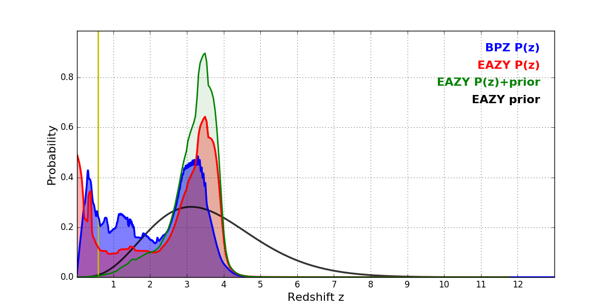 In P(z) plots: Yellow lines mark the cluster redshift z = 0.586,