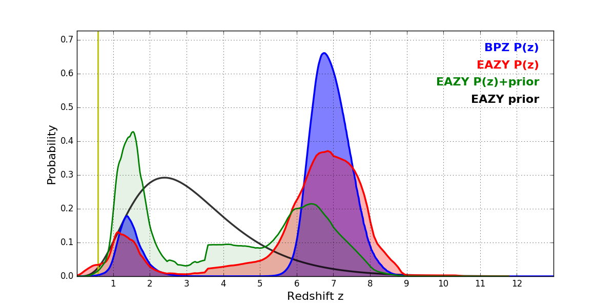 In P(z) plots: Yellow lines mark the cluster redshift z = 0.586,