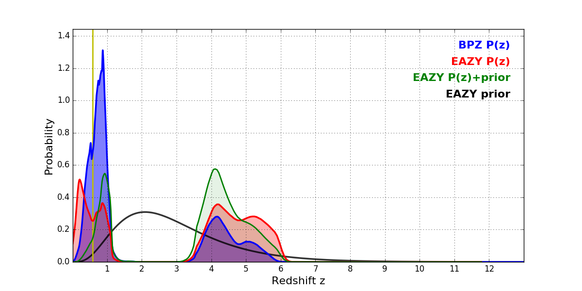In P(z) plots: Yellow lines mark the cluster redshift z = 0.586,